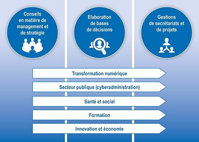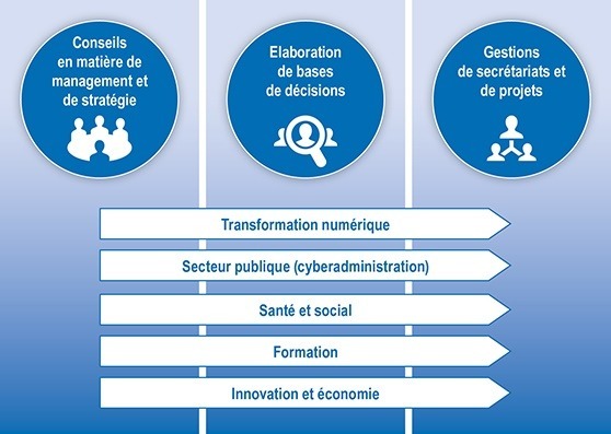 Nos prestations Trois points focaux forment notre paquet de services conseil en matière de management et de stratégie l‘élaboration de bases de décision la gestion de secrétariats et de projets